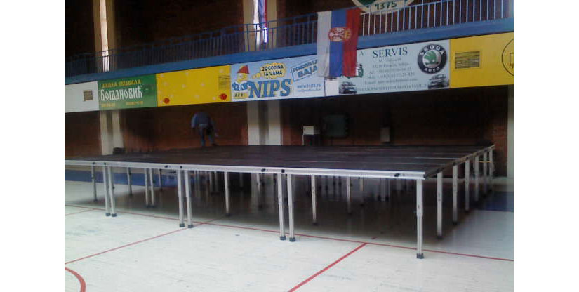 Isporučena bina je modularnog tipa sastavljena od panela dimenzija 200 x 100 x 9 cm, model Bravo i oslanja se na podesive aluminijumske noge dimenzija 60 x 60 mm, debljine zida 4mm, dok je visina podesiva u rasponu od 60 cm do 1,0m. Okvir panela je izrađen od aluminijuma najvišeg kvaliteta, dok se za ploču koristi brodska šperploča debljine 12mm koja je vatro i vodootporna i sa gornje strane presvučena zaštitom protiv klizanja.